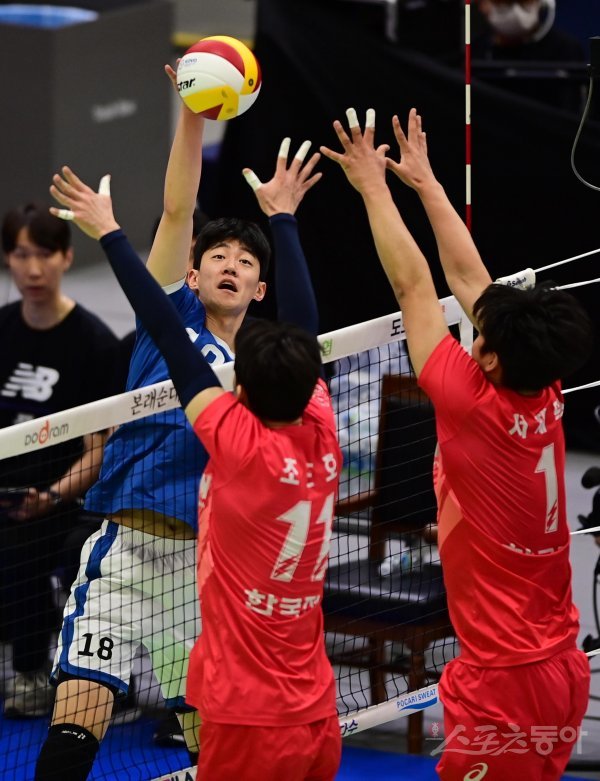 26일 경기도 수원실내체육관에서 열린 ‘2022-2023 도드람 V-리그’ 포스트시즌 남자부 수원 한국전력과 천안 현대캐피탈의 플레이오프 2차전 경기에서 현대캐피탈 홍동선이 밀어넣기 공격을 하고 있다.