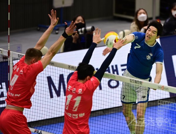 26일 경기도 수원실내체육관에서 열린 ‘2022-2023 도드람 V-리그’ 포스트시즌 남자부 수원 한국전력과 천안 현대캐피탈의 플레이오프 2차전 경기에서 현대캐피탈 허수봉이 한국전력 블로커 앞에서 스파이크를 하고 있다.