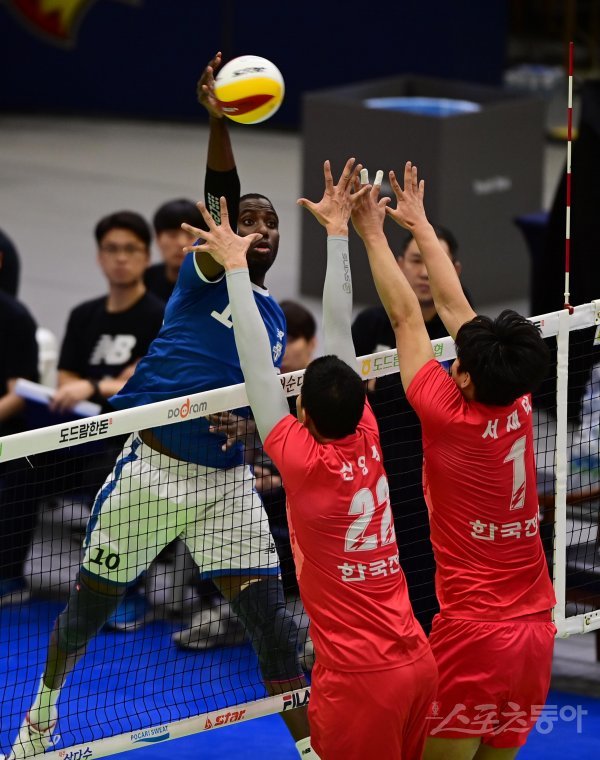 26일 경기도 수원실내체육관에서 열린 ‘2022-2023 도드람 V-리그’ 포스트시즌 남자부 수원 한국전력과 천안 현대캐피탈의 플레이오프 2차전 경기에서 현대캐피탈 오레올이 한국전력 블로커 앞에서 스파이크를 하고 있다.