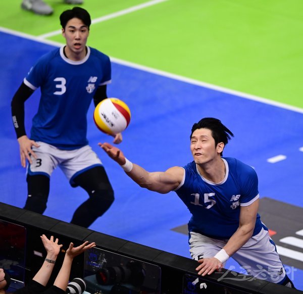 26일 경기도 수원실내체육관에서 열린 ‘2022-2023 도드람 V-리그’ 포스트시즌 남자부 수원 한국전력과 천안 현대캐피탈의 플레이오프 2차전 경기에서 현대캐피탈 문성민이 관중석으로 손을 뻗어 디그하고 있다.