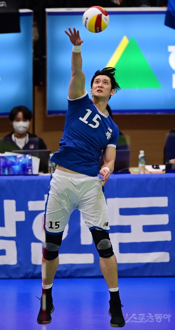 26일 경기도 수원실내체육관에서 열린 ‘2022-2023 도드람 V-리그’ 포스트시즌 남자부 수원 한국전력과 천안 현대캐피탈의 플레이오프 2차전 경기에서 현대캐피탈 문성민이 서브를 하고 있다.