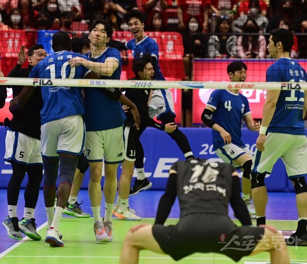 26일 경기도 수원실내체육관에서 열린 ‘2022-2023 도드람 V-리그’ 포스트시즌 남자부 수원 한국전력과 천안 현대캐피탈의 플레이오프 2차전 경기에서 4세트를 역전한 현대캐피탈 선수들이 기뻐하고 있다.