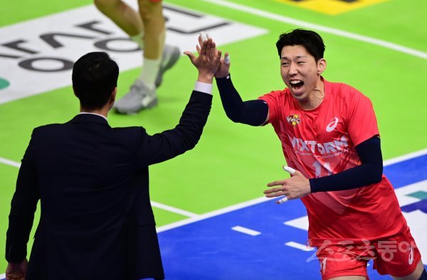 26일 경기도 수원실내체육관에서 열린 ‘2022-2023 도드람 V-리그’ 포스트시즌 남자부 수원 한국전력과 천안 현대캐피탈의 플레이오프 2차전 경기에서 한국전력 조근호가 블로킹 득점에 성공한 후 감독과 하이파이브를 하고 있다.