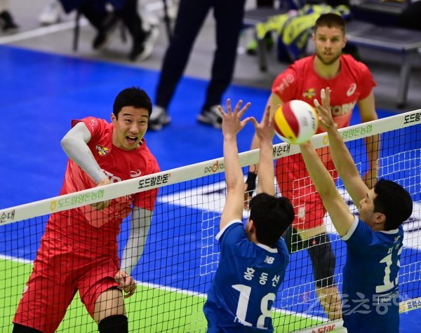 26일 경기도 수원실내체육관에서 열린 ‘2022-2023 도드람 V-리그’ 포스트시즌 남자부 수원 한국전력과 천안 현대캐피탈의 플레이오프 2차전 경기에서 한국전력 신영석이 현대캐피탈 블로커 앞에서 스파이크를 하고 있다.