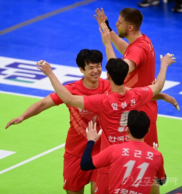 26일 경기도 수원실내체육관에서 열린 ‘2022-2023 도드람 V-리그’ 포스트시즌 남자부 수원 한국전력과 천안 현대캐피탈의 플레이오프 2차전 경기에서 서브 득점에 성공한 한국전력 서재덕이 동료들과 기쁨을 나누고 있다.