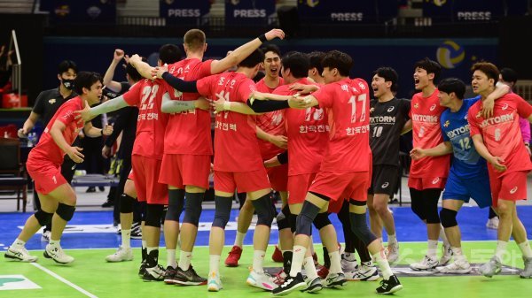 26일 경기도 수원실내체육관에서 열린 ‘2022-2023 도드람 V-리그’ 포스트시즌 남자부 수원 한국전력과 천안 현대캐피탈의 플레이오프 2차전 경기에서 세트스코어 3-2로 승리한 한국전력 선수들이 기뻐하고 있다.