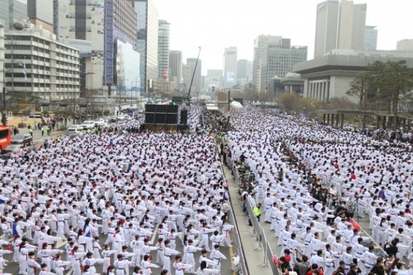 ‘국기’ 태권도의 태극 1장 품새가 광화문광장의 봄을 수놓았다. 하얀색 태권도복을 입은 1만2000여 명의 태권도 유단자와 수련인들의 몸짓은 태권도의 의미를 되새기게 했다.어린이부터 80대·외국인까지 참가