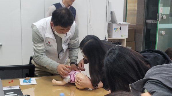 교육과정은 ▲응급상황 발생 시 대처요령 ▲심폐소생술 ▲자동심장충격기 사용법 ▲어린이 응급처치 기초 ▲기도 폐쇄 시 대처 방법 등으로 구성됐으며 심폐소생술 교육용 인형을 활용해 실습 교육이 진행됐다.