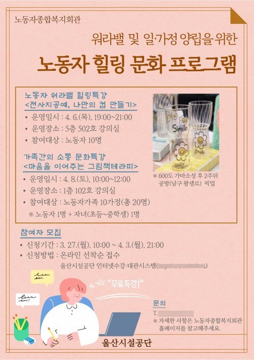이번 힐링문화프로그램은 노동자들의 워라벨과 일·가정의 양립을 지원하고자 마련한 무료 특강으로 전사지를 활용한 유리공예와 마음을 이어주는 그림책테라피가 진행될 예정이다.