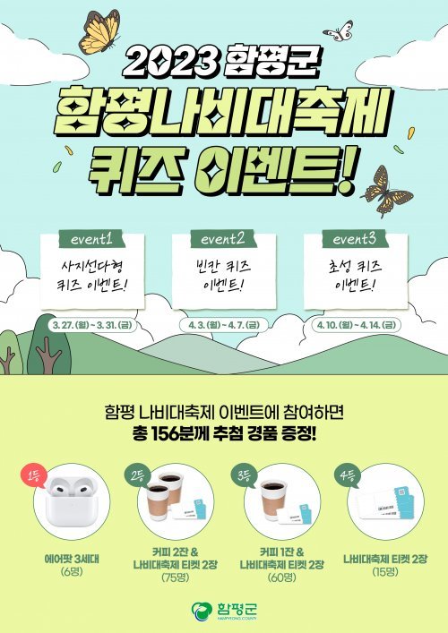 이벤트에 참여하기 위해선 △나비대축제 퀴즈 풀기 △함평군 유튜브 및 (재)함평축제관광재단 유튜브 팔로우 하기 △네이버 폼에 퀴즈 정답 및 구독 인증샷 제출하기 △응원 댓글과 이벤트 공유하기 등을 하면 된다.