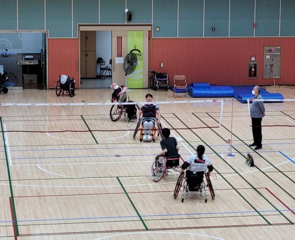 한마음스포츠센터 체육관에서 장애인들이 휠체어 배드민턴 운동을 하는 모습. 사진제공ㅣ부산시설공단