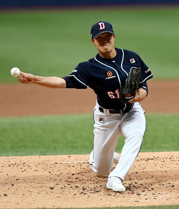 27일 서울 고척스카이돔에서 ‘2023 KBO리그’ 키움 히어로즈와 두산 베어스의 시범경기가 열렸다. 두산 선발투수 최원준이 힘차게 볼을 던지고 있다.
