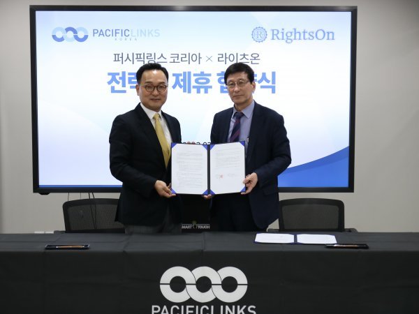 퍼시픽링스코리아 김병기 부사장(오른쪽)이 라이츠온 이종현 대표와 전략적 업무 협약식을 마친 뒤 기념 포즈를 취하고 있다. 사진제공 | 퍼시픽링스코리아