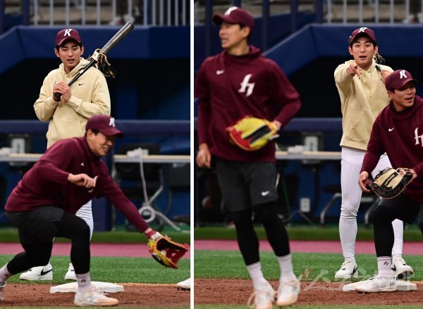 28일 서울 고척스카이돔에서 열린 ‘2023 KBO리그’ 키움 히어로즈와 두산 베어스의 시범경기에 앞서 키움 이정후가 송성문의 수비 훈련에 손짓하고 있다.