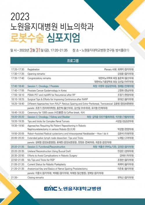 노원을지대학교병원은 31 오후 5시30분부터 연구동 범석홀에서 ‘비뇨의학과 로봇수술 심포지엄’을 개최한다. ‘여러 비뇨기질환에서 로봇수술의 적용 및 성과’라는 주제로 열리는 이번 심포지엄은 올해 1월 비뇨기질환 로봇수술 1000례 달성을 기념하기 위해 마련했다. 대한비뇨의학회 홍준혁 회장, 대한비뇨기종양학회 김선일 회장이 참석하고 비뇨기질환 로봇수술 권위자들이 강의ㅇ 나선다.