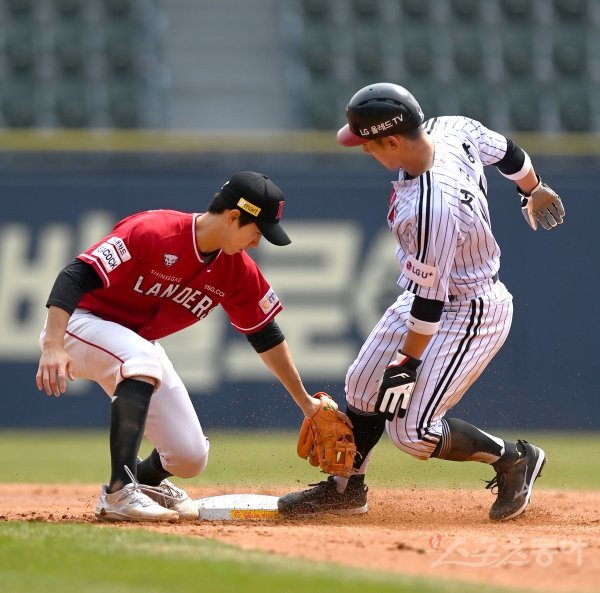 28일 서울 잠실야구장에서 2023 KBO리그 시범경기 SSG 랜더스와LG 트윈스 경기가 열렸다. 3회말 2사 1루 상황에서 LG 1루주자 서건창이 2루 도루에 성공하고 있다.