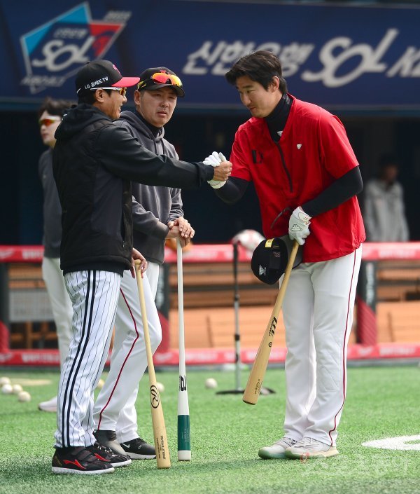 28일 서울 잠실야구장에서 2023 KBO리그 시범경기 SSG 랜더스와LG 트윈스 경기가 열렸다. LG 염경엽 감독과 SSG 오태곤이 인사를 하고 있다.