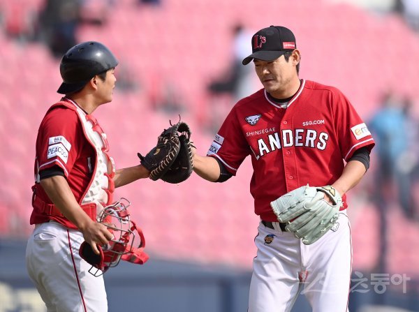 28일 서울 잠실야구장에서 2023 KBO리그 시범경기 SSG 랜더스와LG 트윈스 경기가 열렸다. 9회말 교체 등판한 SSG 노경은이 승리한 후 하이파이브 하고 있다.
