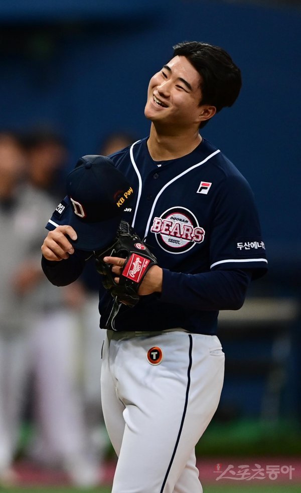 28일 서울 고척스카이돔에서 열린 ‘2023 KBO리그’ 키움 히어로즈와 두산 베어스의 시범경기에서 2-1로 승리한 두산 최지강이 동료를 보며 웃고 있다.