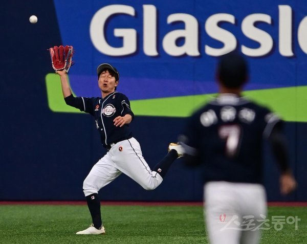 28일 서울 고척스카이돔에서 열린 ‘2023 KBO리그’ 키움 히어로즈와 두산 베어스의 시범경기에서 1회말 무사 키움의 안타 때 두산 중견수 정수빈이 볼을 놓치고 있다.