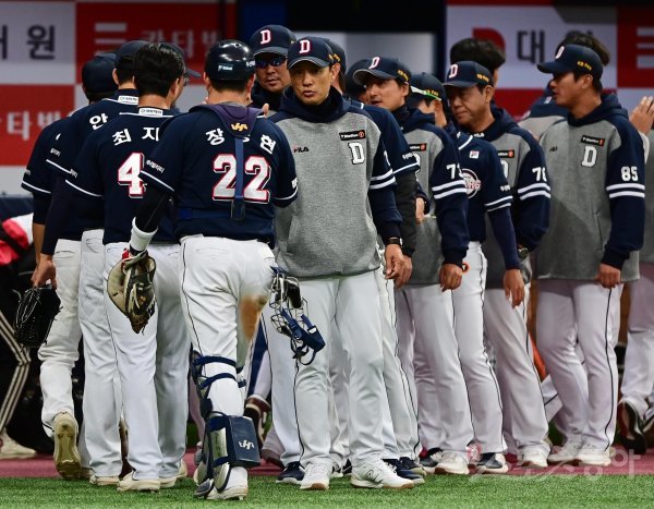28일 서울 고척스카이돔에서 열린 ‘2023 KBO리그’ 키움 히어로즈와 두산 베어스의 시범경기에서 2-1로 승리한 두산 이승엽 감독이 선수들과 기쁨을 나누고 있다.