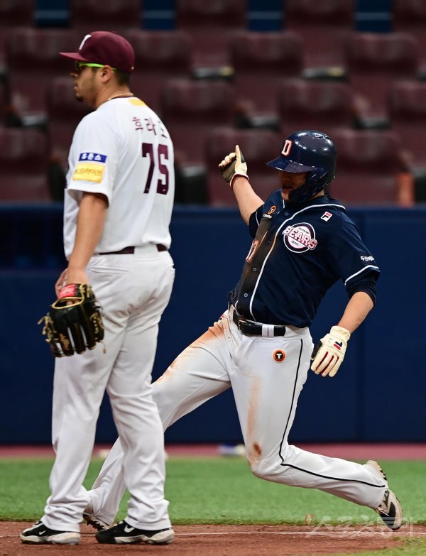 28일 서울 고척스카이돔에서 열린 ‘2023 KBO리그’ 키움 히어로즈와 두산 베어스의 시범경기에서 5회초 2사 1루 두산의 안타 때 실책을 틈타 1루주자 김대한이 득점에 성공하고 있다.