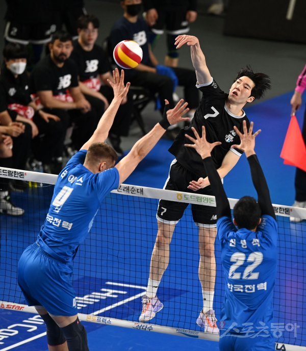 28일 천안 유관체육관에서 열린 ‘2022-2023 도드람 V-리그’ 남자부 플레이오프 3차전 현대캐피탈과 한국전력 경기에서 현대캐피탈 허수봉이 한국전력의 블로킹 사이로 스파이크를 날리고 있다.