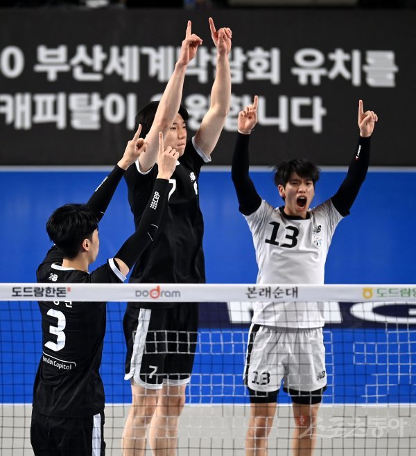 28일 천안 유관체육관에서 열린 ‘2022-2023 도드람 V-리그’ 남자부 플레이오프 3차전 현대캐피탈과 한국전력 경기에서 현대캐피탈 허수봉이 서브 득점에 성공한 후 기뻐하고 있다.