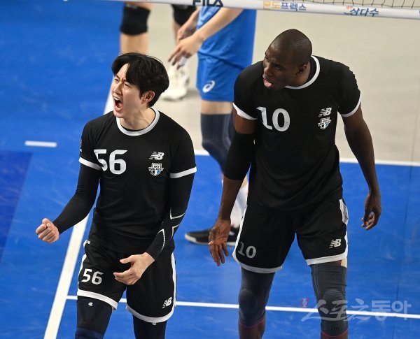 28일 천안 유관체육관에서 열린 ‘2022-2023 도드람 V-리그’ 남자부 플레이오프 3차전 현대캐피탈과 한국전력 경기에서 헌대캐피탈 이시우가 득점에 성공한 후 기뻐하고 있다.