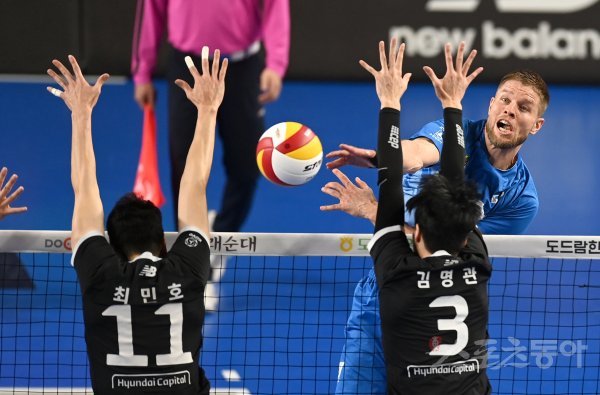 28일 천안 유관체육관에서 열린 ‘2022-2023 도드람 V-리그’ 남자부 플레이오프 3차전 현대캐피탈과 한국전력 경기에서 한국전력 타이스가 현대캐피탈의 블로킹 사이로 스파이크를 날리고 있다.