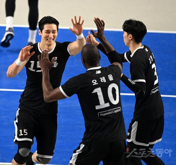 28일 천안 유관체육관에서 열린 ‘2022-2023 도드람 V-리그’ 남자부 플레이오프 3차전 현대캐피탈과 한국전력 경기에서 헌대캐피탈 문성민이 득점에 성공한 후 기뻐하고 있다.
