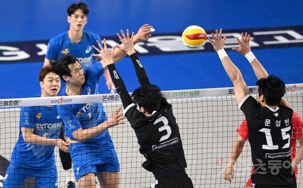 28일 천안 유관체육관에서 열린 ‘2022-2023 도드람 V-리그’ 남자부 플레이오프 3차전 현대캐피탈과 한국전력 경기에서 한국전력 서재덕이 현대캐피탈의 블로킹 사이로 스파이크를 날리고 있다.