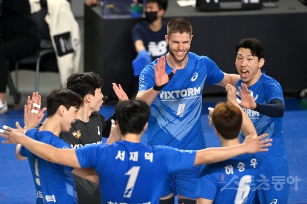 28일 천안 유관체육관에서 열린 ‘2022-2023 도드람 V-리그’ 남자부 플레이오프 3차전 현대캐피탈과 한국전력 경기에서 한국전력 타이스와 조근호가 득점에 기뻐하고 있다.
