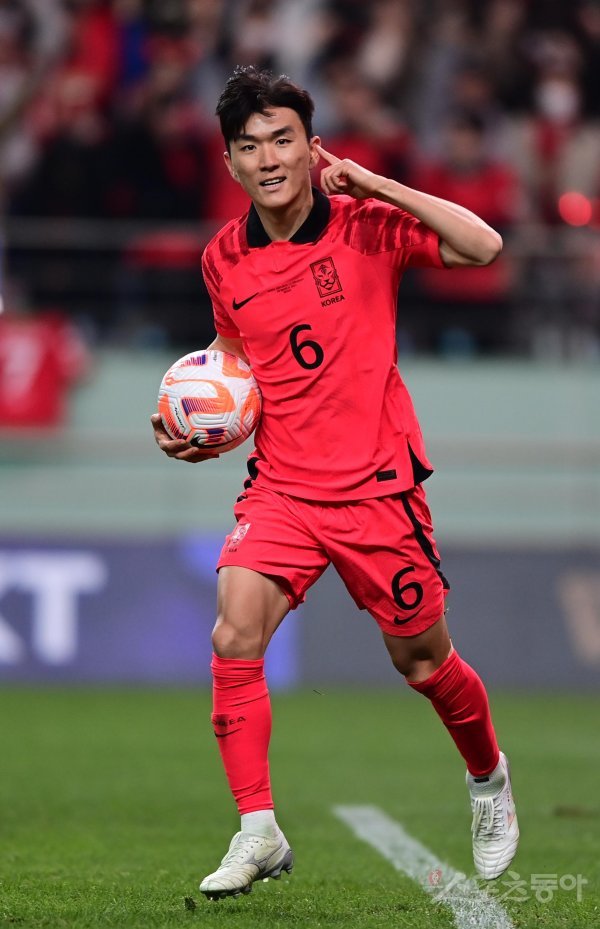 28일 서울월드컵경기장에서 열린 한국과 우루과이의 평가전 경기에서 한국 황인범이 동점골을 성공시킨 후 세리머니를 하고 있다.