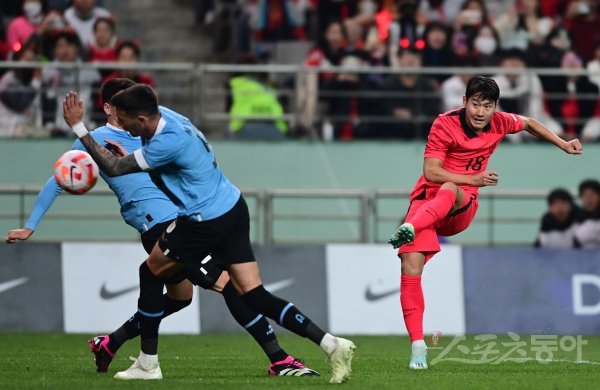 28일 서울월드컵경기장에서 열린 한국과 우루과이의 평가전 경기에서 한국 이강인이 슈팅을 하고 있다.
