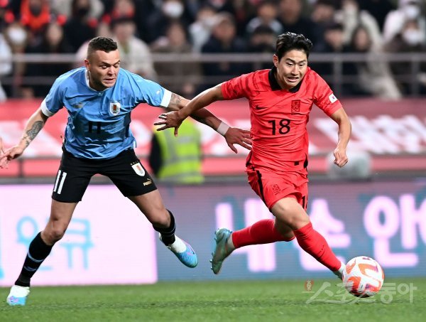 28일 서울 마포구 서울월드컵경기장에서 한국과 우루과이의 축구대표팀 평가전에서 한국 이강인이 우루과이 수비를 제치며 돌파하고 있다.