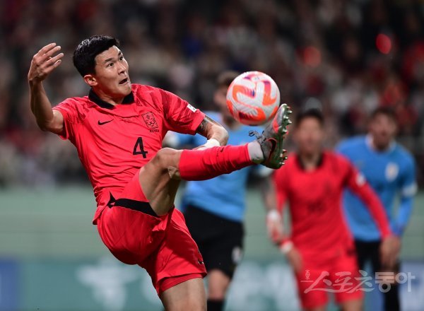 28일 서울월드컵경기장에서 열린 한국과 우루과이의 평가전 경기에서 한국 김민재가 동료에게 패스하고 있다.