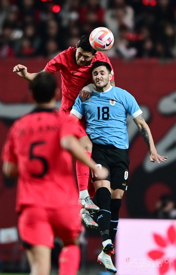 28일 서울월드컵경기장에서 열린 한국과 우루과이의 평가전 경기에서 한국 김민재가 헤딩을 하고 있다.