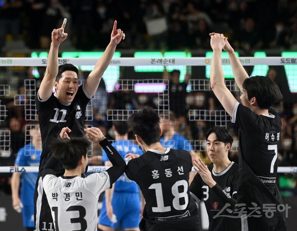 28일 천안 유관체육관에서 열린 ‘2022-2023 도드람 V-리그’ 남자부 플레이오프 3차전 현대캐피탈과 한국전력 경기에서 현대캐피탈 최민호가 득점에 성공한 후 기뻐하고 있다.