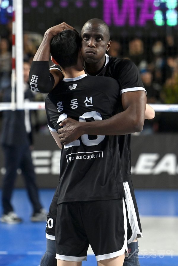 28일 천안 유관체육관에서 열린 ‘2022-2023 도드람 V-리그’ 남자부 플레이오프 3차전 현대캐피탈과 한국전력 경기에서 현대캐피탈 오레올이 득점에 성공한 후 기뻐하고 있다.