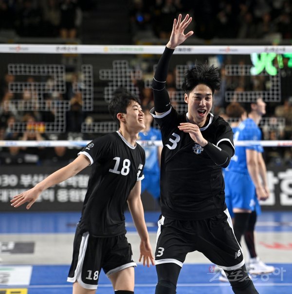 28일 천안 유관체육관에서 열린 ‘2022-2023 도드람 V-리그’ 남자부 플레이오프 3차전 현대캐피탈과 한국전력 경기에서 현대캐피탈 김명관이 블로킹 득점에 성공한 후 기뻐하고 있다.