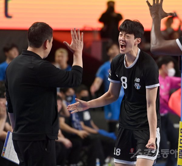28일 천안 유관체육관에서 열린 ‘2022-2023 도드람 V-리그’ 남자부 플레이오프 3차전 현대캐피탈과 한국전력 경기에서 현대캐피탈 홍동선이 득점에 성공한 후 기뻐하고 있다.