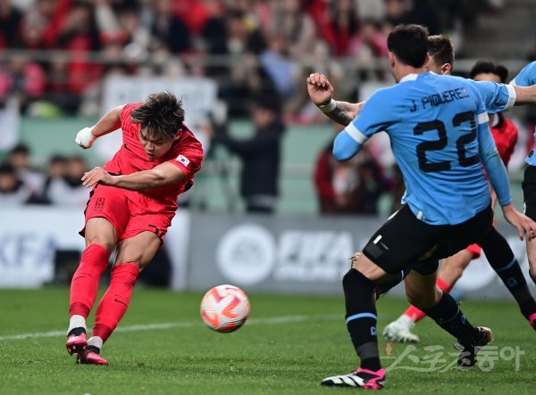 28일 서울월드컵경기장에서 열린 한국과 우루과이의 평가전 경기에서 한국 오현규가 두 번째 동점골을 성공시켰지만 오프사이드 판정으로 취소됐다.