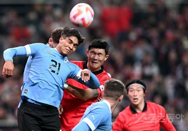 28일 서울 마포구 서울월드컵경기장에서 한국과 우루과이의 축구대표팀 평가전에서 한국 김민재가 헤딩슛을 시도하고 있다.