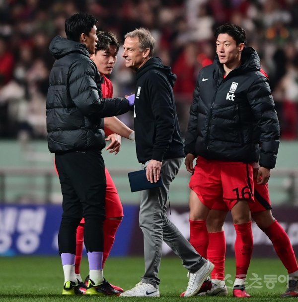 28일 서울월드컵경기장에서 열린 한국과 우루과이의 평가전 경기에서 1-2로 패한 한국 클린스만 감독이 선수들을 격려하고 있다.