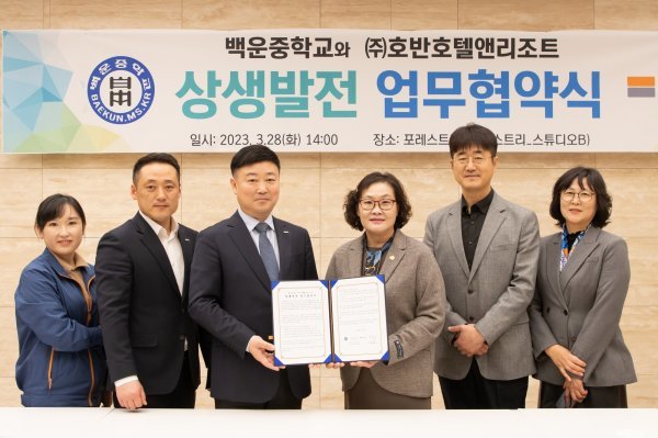 호반그룹의 호반호텔앤리조트는 28일 제천시백운중학교와 지역사회와의 문화상생과 동반성장을 위한 업무 협약을 체결했다.이번 협약은 지역 내 작은 규모의 학교에 물적, 인적 자원을 지원해 활성화를 꾀하고 상호 간 시설 교류로 양질의 교육 서비스를 제공하는 건강한 교육생태계 조성을 위해 마련했다.