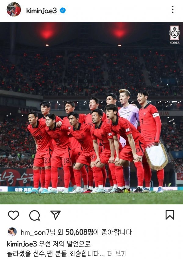 김민재의 사과에 축구팬들은 큰 관심을 보였다. 또 한국 축구 공격의 핵심이자 주장인 손흥민은 이 게시물에 ‘좋아요’를 눌렀다.