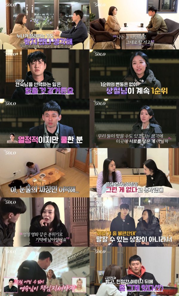 반면 데이트 선택을 받지 못해 ‘고독정식’을 먹은 영자는 “여기 출연하면서 진짜 안 하고 싶었던 것들만 다 했다. 첫인상 0표, 혼자 울면서 짜장면 먹는 거, 내가 호감 있는 사람이 반응 없어서 어필하려고 아침 만드는 것”이라며 눈물을 쏟아냈다.