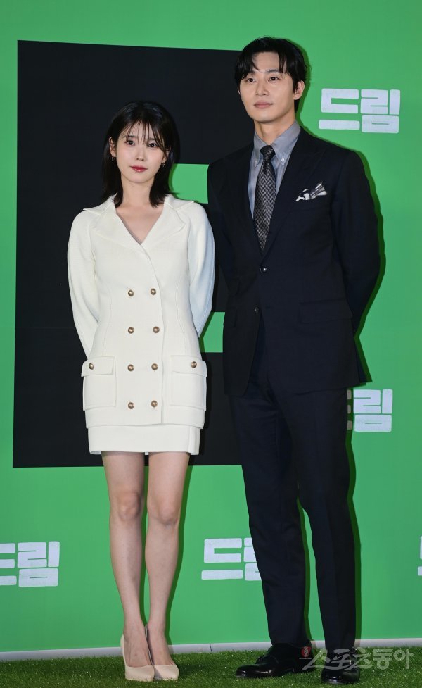 배우 아이유, 박서준이 30일 서울 성동구 성수동 메가박스 성수점에서 열린 영화 ‘드림’ 제작보고회에서 포즈를 취하고 있다.