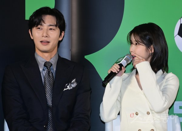 가수 겸 배우 아이유가 30일 서울 성동구 성수동 메가박스 성수점에서 열린 영화 ‘드림’ 제작보고회에서 진행자의 질문에 답하고 있다.